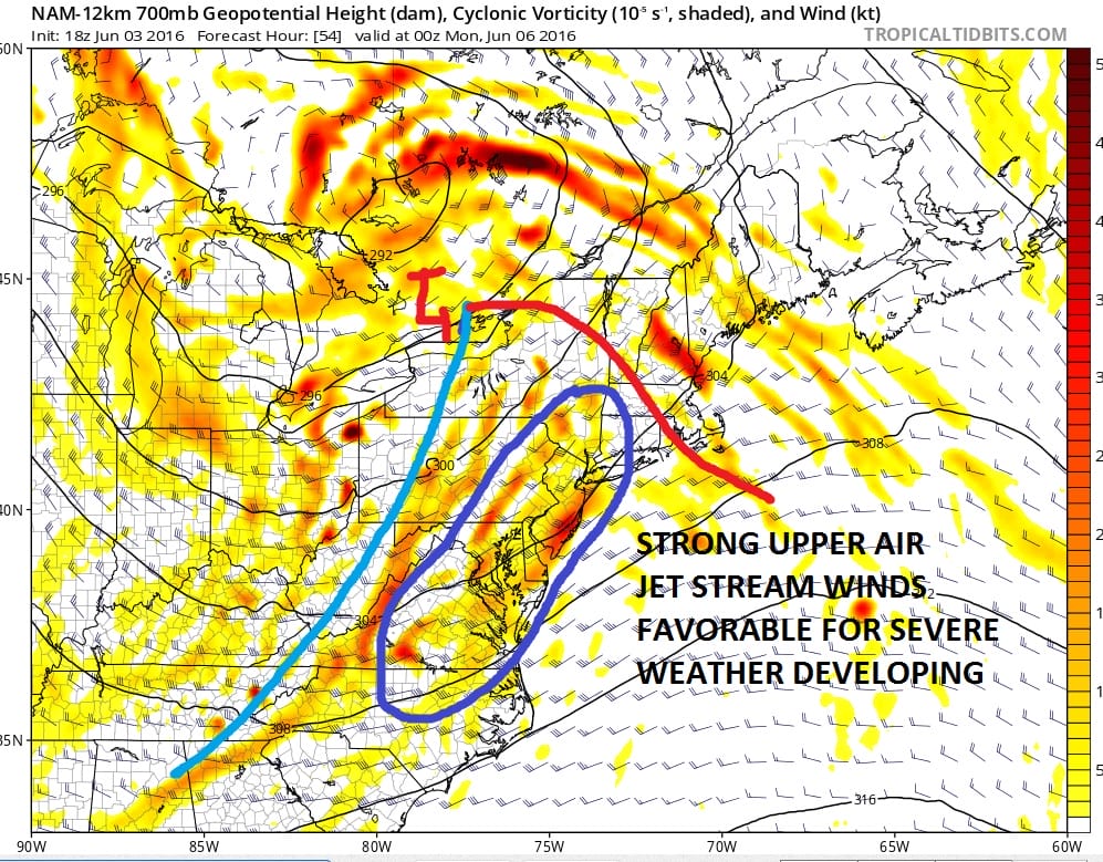 Sunday is a different story as the warm sector sets up along the Middle Atlantic Coast northeastward to Southern New England. The upper air is strongly suggesting severe weather with the greatest risk probably from Eastern Virginia northeastward into Southern New Jersey where the Storm Prediction Center is calling for the possibility of some super cell formation. The upper air map below shows a strong jet stream streak inside the blue circle which would be a severe weather indicator. The biggest question is how the warm sector sets up. This will drive the severe weather threat for Long Island and Connecticut which often times can be out of the prime formation area.