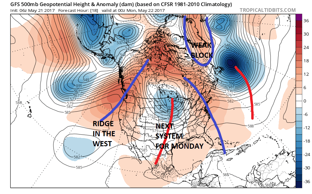 The rainfall forecast on the gfs is spread out over the entire week which would be on the order of 1 to 2 inches. This would not be a big deal. It’s just that we will have to deal with lots of clouds all week. How this blocks breaks down (or doesn’t break down) will impact the Memorial Day weekend. We will have more on this later today.