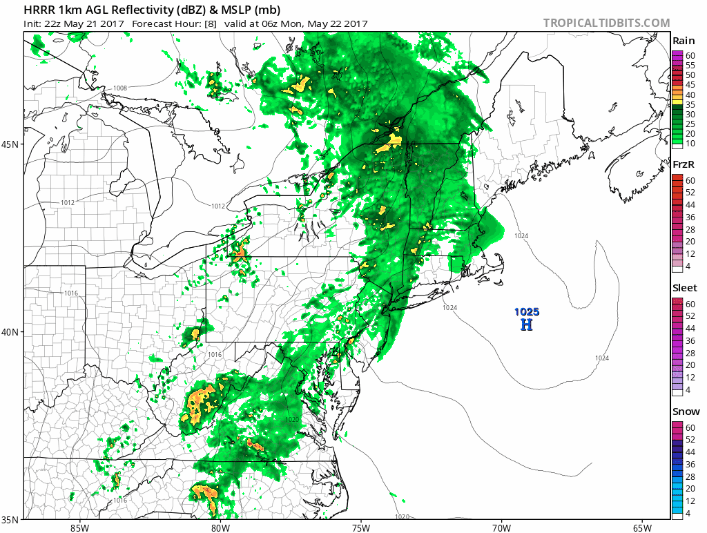 When we look at the HRRR model for Monday morning you can see the first area of rain about to move out during the morning rush hour around NYC and Long Island, However a second area of rain generates to the south across Southeast Pennsylvania and Southern New Jersey.