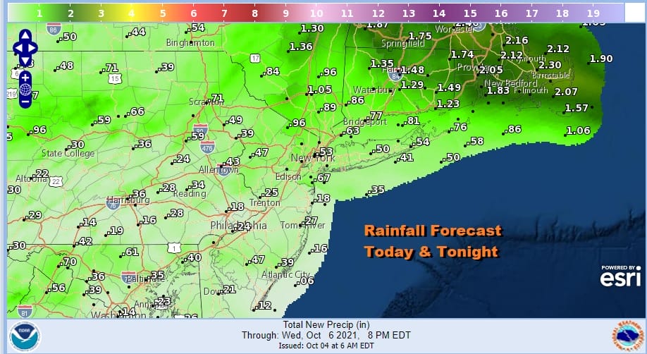 As far as rainfall is concerned this week, the bulk comes today and tonight. Except for Southeastern New England where rainfall amounts will be on the order of 1 to 2 inches or more, most of the area from Eastern Pennsylvania to Southern New England is looking at a quarter to a half inch total.