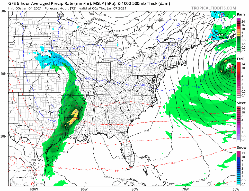 We have been in what I would describe as a blocky pattern since the beginning of December and it has already yielded one major snow storm in the Northeast so far this winter. Now I would describe the pattern as one with a strengthening block. This may be an example of what happens when you have too much blocking. The low to the northeast is stuck new Newfoundland. This will likely prevent the strong trough and low pressure moving across the Gulf States from moving northward up the coast. Instead it will likely slide out to the east northeast.