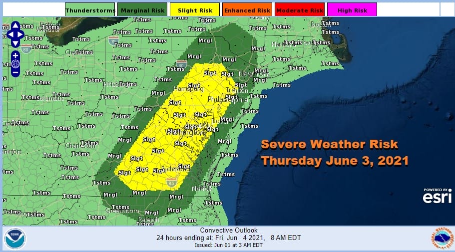The weather highlight this week is Thursday when we have severe weather risk. The Storm Prediction Center has already indicated a marginal to slight risk from Virginia to Southeastern New York including most of New Jersey and Eastern and Southern Pennsylvania, Maryland and Delaware. A cold front will trigger off thunderstorms late in the day. We might also see some scattered showers and thunderstorms early Thursday morning as a warm front pushes northward. It will be a sticky day with higher humidity and highs will be in the 70s to some lower 80s inland.
