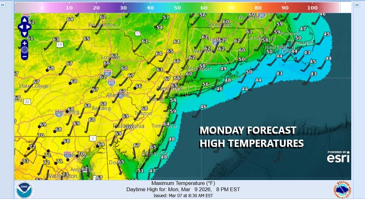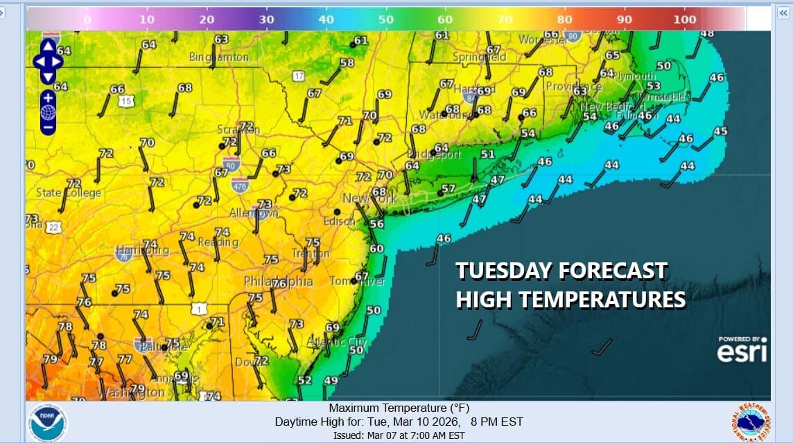 Tuesday sees even warmer temperatures thanks to sunshine and that will take highs into the 70s away from the coast. However once again south winds will be in play so that keeps coastal areas like the coastal counties of New Jersey and Long Island as well as coastal Southern New England about 10 to 15 degrees cooler during afternoon and evening hours. Wednesday looks dry and warm but we will see the chance for showers and thunderstorms Wednesday night and Thursday as the next storm system goes by to our north and a cold front pushes into the Eastern US.