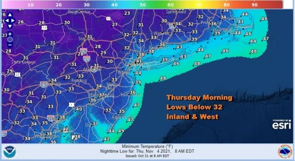 The front goes by and then a re-enforcement of colder air comes in Tuesday night. Wednesday morning lows will be in the 30s with some areas inland close the freezing mark. Coastal areas and warmer urban locations will be closer to 40. Some inland areas could see a light freeze or some patchy frost.