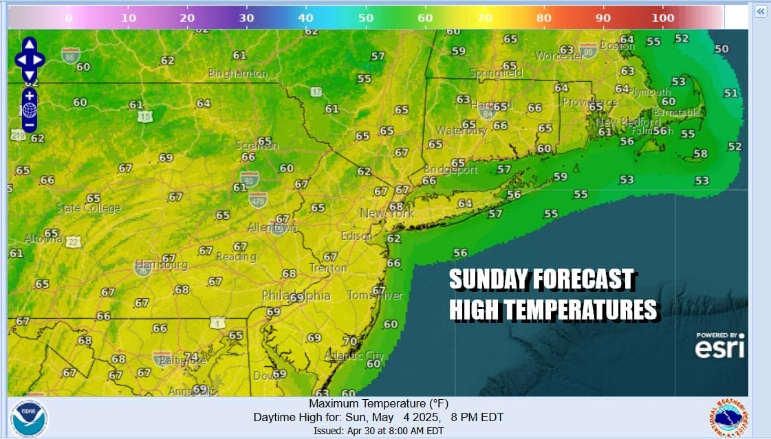 The Storm Prediction Center is indicating a large geographic area of marginal risk which means the potential for isolated severe thunderstorms. However it is likely that the Storm Prediction Center will add an area of slight risk somewhere in the Northern Mid Atlantic once the forecast becomes clearer. Temperatures Saturday will be in the 80s away from the coast and 70s along south and east facing shorelines.