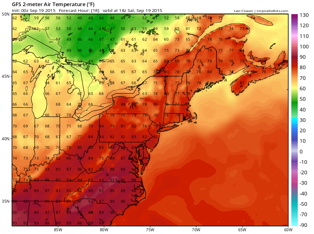 However there is one complication for this week that we should continue watching and that is disturbed weather and low pressure off the southeast coast of the United States. Whenever you have a situation like this with high pressure to the north, we have to consider the possibility of clouds being thrown back from the east and the possibility of some showers as well. Clouds stand a chance of being thrown in but for now the chance for showers would appear to be remote for Tuesday and beyond but we still don’t want to completely discount the possibility.