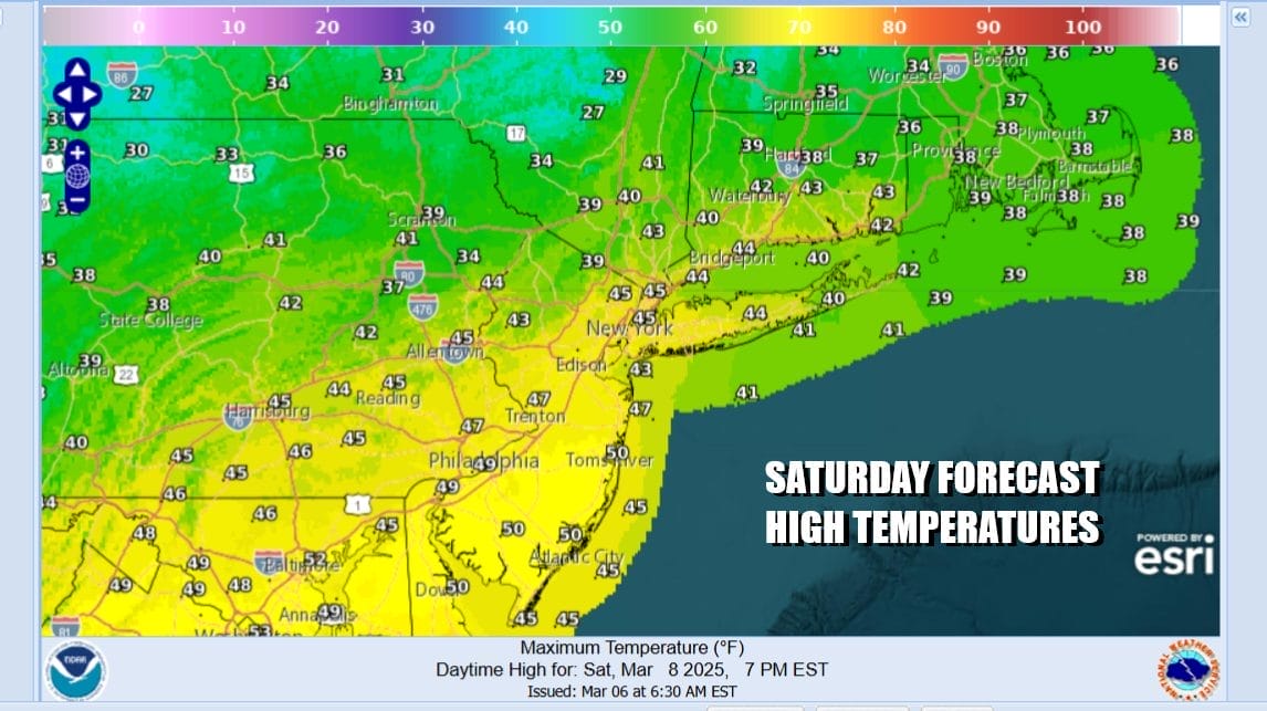 Monday sees sunshine and a west wind and high temperatures will climb into the 60s in many locations except for mid to upper 50s across the Hudson Valley and Southern New England. South and east facing shoreline areas will probably be in the 40s. Tuesday we will take temperatures a little higher with sunshine. Highs will be in the 60s and some warm spots could reach 70.