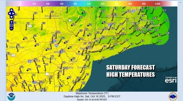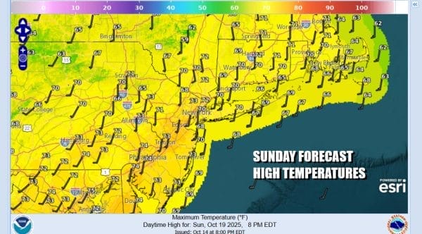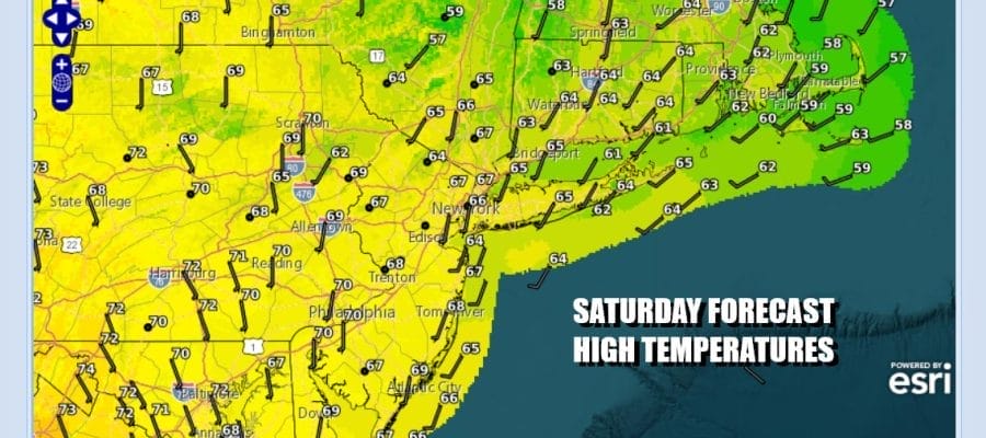 Winds have turned southerly over much of Eastern Pennsylvania to Southern New England. This is bringing warmer air up the East Coast and it is also setting us up for showers and thunderstorms coming Sunday night into Monday. Until then if you have weekend plans you can go ahead with them without issues. We will see a fair amount of sunshine today though satellite loops are showing some high clouds coming in from the west. This is blow off from showers and storms that are still far away to the west. Highs today will reach the low and middle 60s in most place