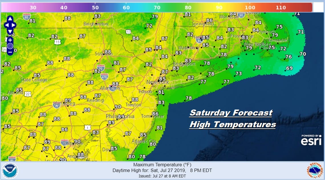 Sunday the winds will turn southwest as the high offshore drops to well off the Mid Atlantic coast. This will bring the temperatures higher as well as the humidity. Sunday I would consider uncomfortable as highs reach the upper 80s and lower 90s. Again other than a pop up shower or thunderstorm for the vast majority of you it will be rain free.