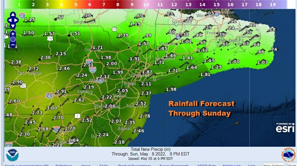 Here we are back in the land of gloom and doom. Rain has already overspread the area from west to east. We have gale warnings in effect for the coastal waters as winds start to pick. Coastal flood watches are up for the coastal counties of New Jersey for flooding at high tide though at least we are at the low point in the lunar cycle. Low pressure is tracking across the lower Ohio Valley. It will cross the Central Appalachians and eventually redevelop along the Mid Atlantic Coast over the weekend. It is a slow process that is going to take several days to play out. In the meantime as far as rainfall is concerned we are looking at the potential for 2 inches plus for most of the area and we will likely see some localized flooding in the usual suspect spots.