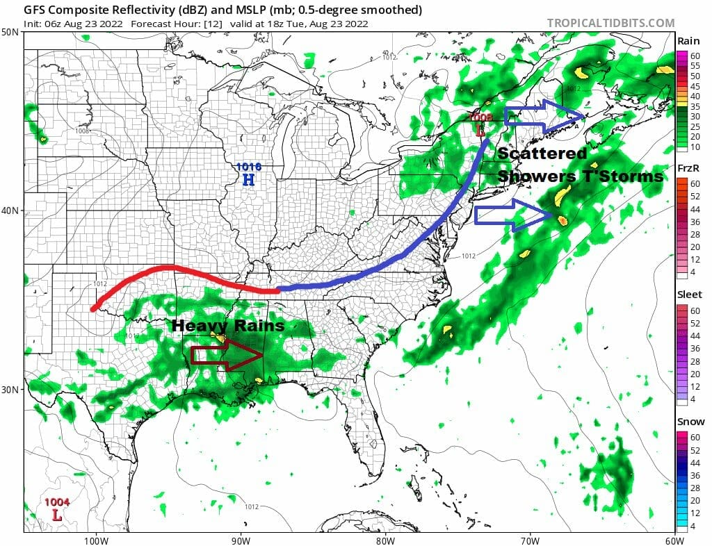 The best chance for any scattered showers will be from Northern Pennsylvania and Northern New Jersey north and east. Most folks will wind up seeing very little. Behind the front is slightly drier air and that should lower humidity somewhat the next two days (Wednesday and Thursday) but more sunshine means higher temperatures.