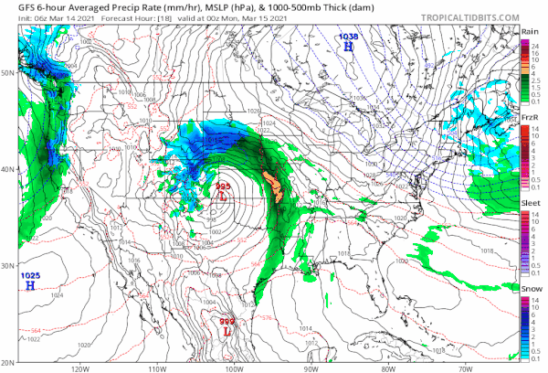 Two weather systems lie in waiting for this week. The first one is the major snow storm going on today in parts of the Central Rockies. That moves east and it weakens rather quickly as it approaches us on Tuesday. We will have lots of clouds with temperatures reaching the low and mid 40s. There could be a few scattered rain or snow showers Tuesday night but this lead system is going to fall apart due to a strong trough to the east suppressing this storm. The second one approaches Thursday and another cold high builds to our north. Wednesday will be dry but then look for a cold raw rainy Thursday into Thursday night as the low passes to our south. Dry chilly conditions will be with us Friday and into next weekend as spring arrives.