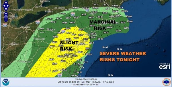 Thanks to all the daytime heating that took temperatures to the mid and upper 70s from NYC south and west we have elevated severe weather risk with slight risk reaching up from Virginia into Northern New Jersey to NYC and a marginal risk to the north in New England. Temperatures are likely to rise east and northeast of NYC this evening as winds turn more southwest and this is the reason for the marginal risk area being indicated to the north. Wind is the primary issue with these thunderstorms.