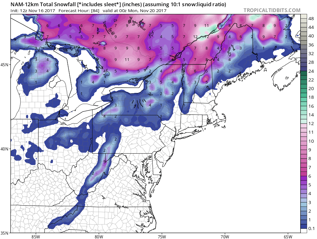 Speaking of snow the lake effect snow machine will be turned on Sunday and the NAM shows mostly manageable amounts though some high amounts in local areas are possible. Lake effect snows will probably continue Sunday night into part of Monday. It is a sign of winter coming into the Northeast little by little, day by day.