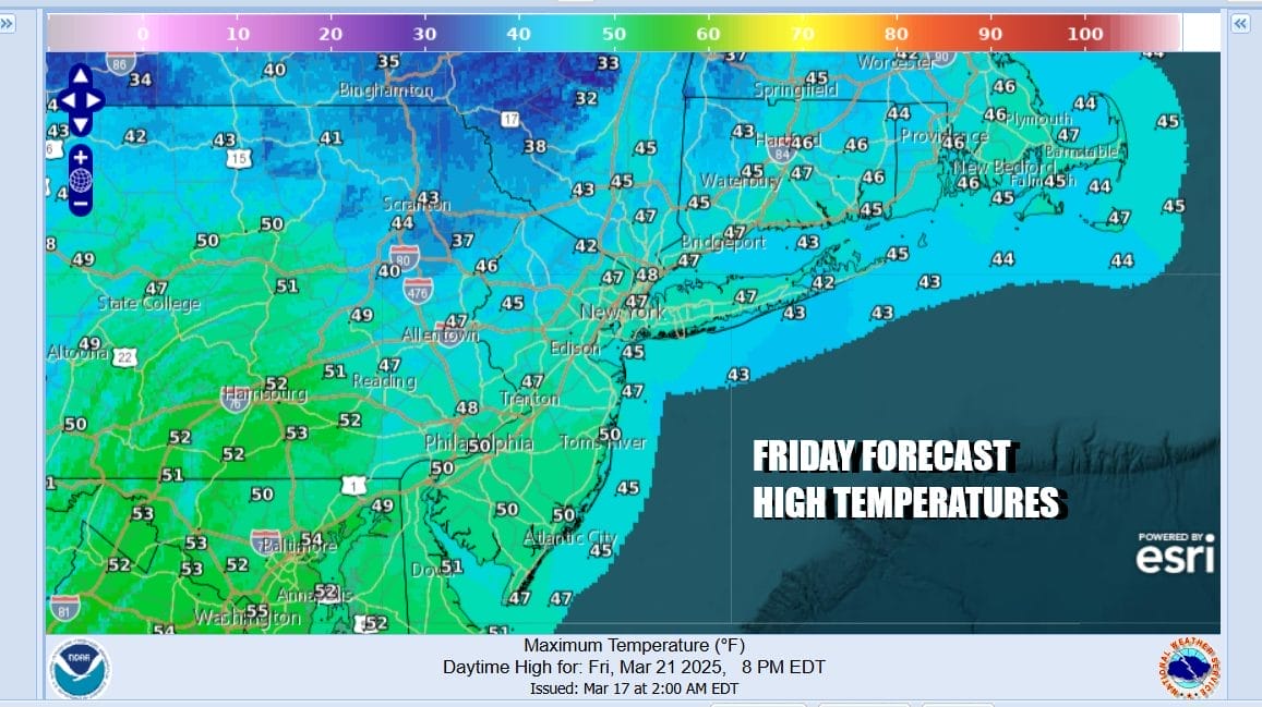 Overnight rain showers have now moved northeast into New England and we are seeing gusty winds and drier air behind low pressure and a cold front to the east. Today will be a day of general weather improvement from west to east across Eastern Pennsylvania to Southern New England. We should see a fair about of sunshine, gusty northwest winds to 40 mph at times, and highs reaching the upper 40s and lower 50s. This is about where we should be for this time of year. Radars have gone quiet locally and we have no precipitation issues to worry about for the rest of today and tonight.