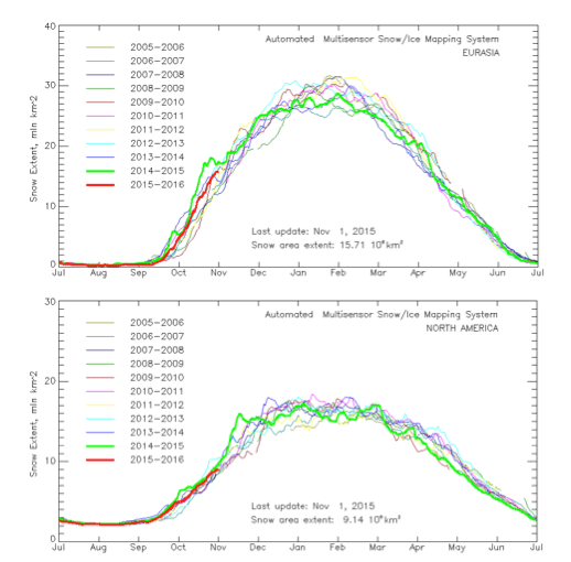 The charts above show the snow cover growth across Siberia south of 60 degrees north while the second chart shows the rate of snow cover growth across North America. With regards to the Siberian growth rate the index has finshed tied for number 3. It finishes behind the last 2 winters 2013-2014 and 2014-2015. It finished tied with 2009-2010. With regards to the North America snow cover growth for which we do not seem to have a strong correlation with snowy cold winters in the east, the snow cover looks to be running at number 2 right behind last winter.