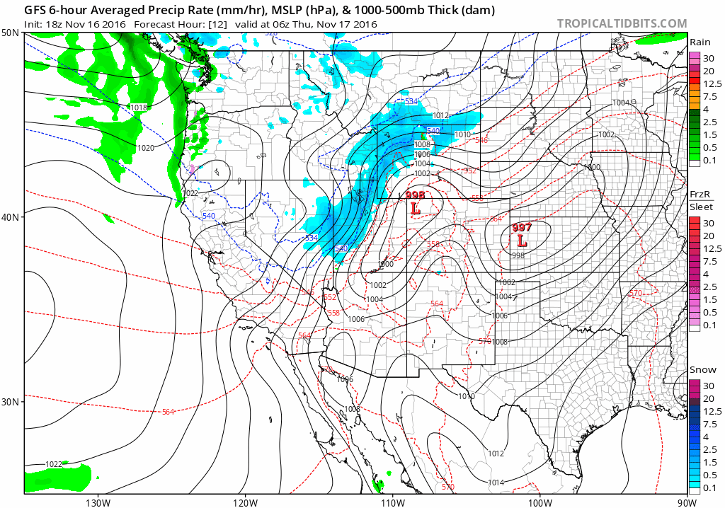 Low pressure is developing in Colorodo and this will be heading northeastward into the Western Great Lakes by Friday. Most areas will see 3 to 6 inches of snow and for many areas it its the first accumulating snow of the season.