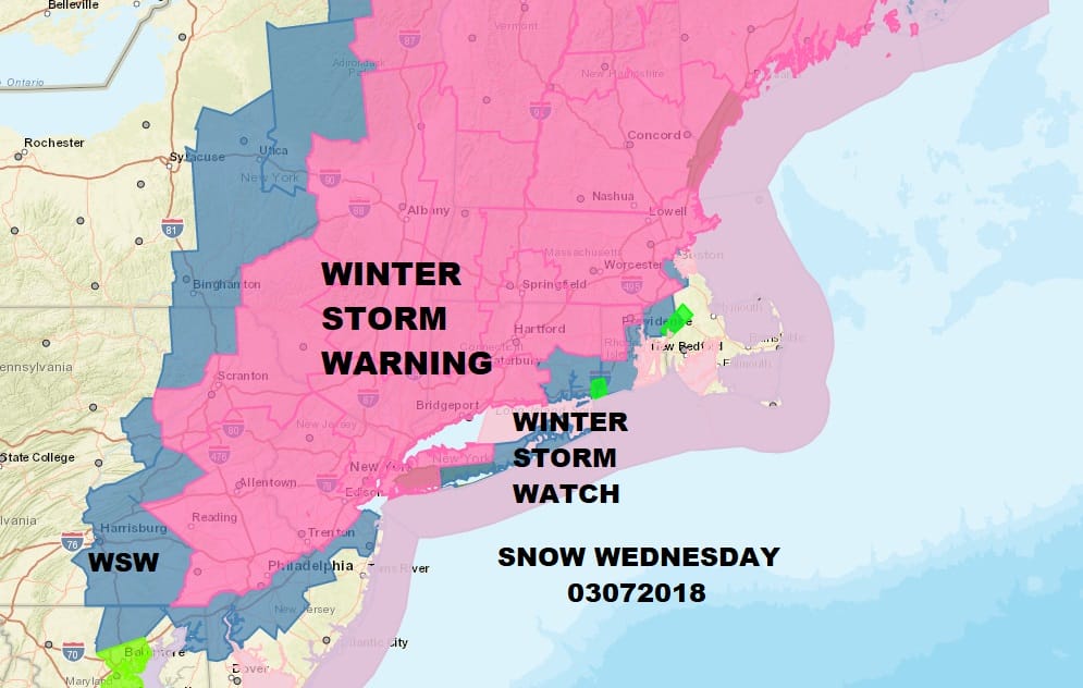 Winter Storm Warnings are now posted for Wednesday after the overnight models remain pretty much on course. Warnings extend from Southeastern Pennsylvania northeastward through Western New Jersey along and north and west of I-95 Including most of Monmouth County northwestward into Northeastern Pennsylvania, the Hudson Valley, NYC, Connecticut & Western Long Island. Winter Storm Watch remains in effect for the western edge of this as well as the eastern edge in the blue as we resolve remaining track and mixing issues.