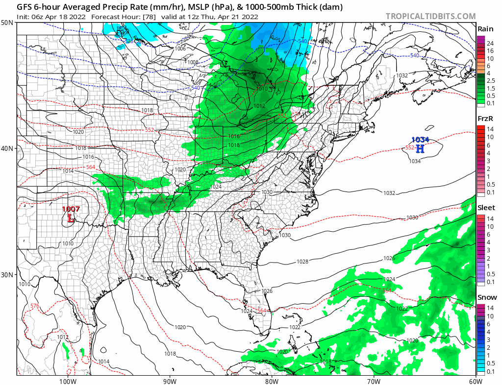 Clouds are already moving up from the south and increasing and rain has broken out across Virginia west to the Ohio Valley. The low center is in Eastern North Carolina and it will move up the coast and strengthen. We have high pressure in Eastern Canada feeding in some cold air. The air is colder aloft and that will be mixing down to lower levels tonight.