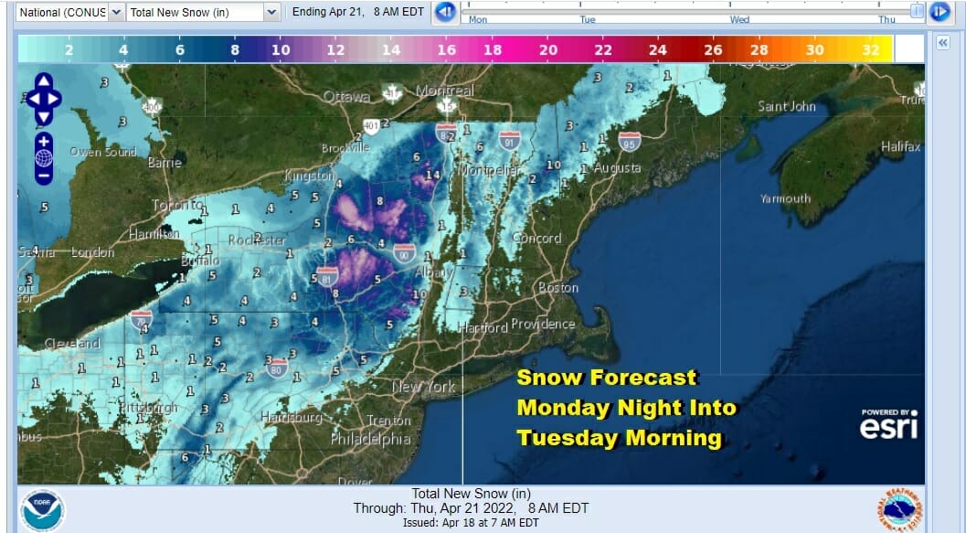 We have a fast moving noreaster heading up the coast tonight from North Carolina. It will be producing late season snows of 6 inches or more for elevated areas well inland from the Catskills and Poconos to the Adirandacks. Along the coast it will be rain wind and some coastal flooding as the low goes by. Winter Storm Warnings are up for affected areas well inland while along the coast we have Gale Warnings and Coastal Flood Advisories and warnings for the coast from Delawsre to Long Island.