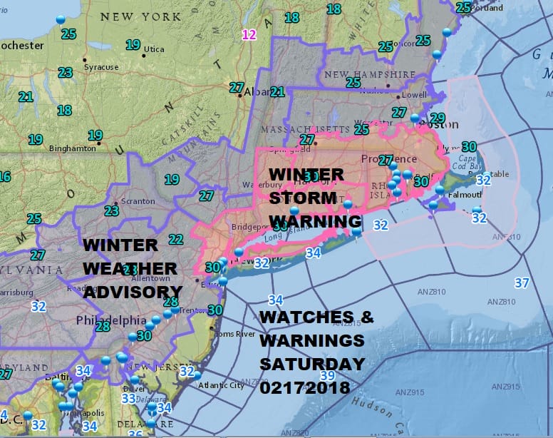 Winter Storm Warning is in effect for Northeast New Jersey, the Hudson Valley along and south of Route 84, All of Connecticut, Parts of NYC north of 495, and Long Island north of the Long Island Expressway. Winter Storm Watch south of the L.I.E. In New Jersey the northeastern counties east of 287 are under a warning while Winter Weather Advisories are up west of 287 into Northeastern Pennsylvania and south in New Jersey to 195. Advisories in Pennsylvania extend into all of Eastern Pennsylvania as well as South Central Pennsylvania and North Central Maryland.