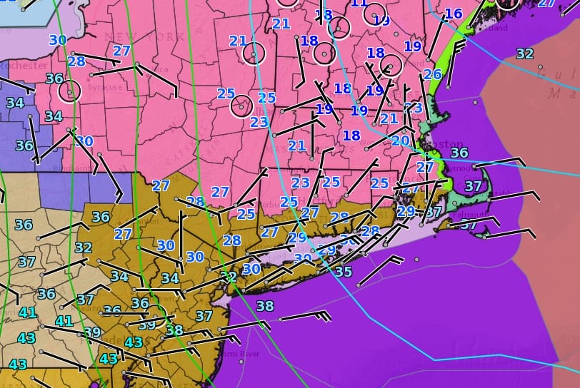 The further north you go into the Hudson Valley and Connecticut the precipitation will become more frozen then freezing. Accumulations of several inches or more are possible. The heaviest snow from this storm will be as you go northeastward into New England. Precipitation ends this evening from west to east and the it will be the wind for Monday with clouds and some sunshine. Highs will just be in the 30s.