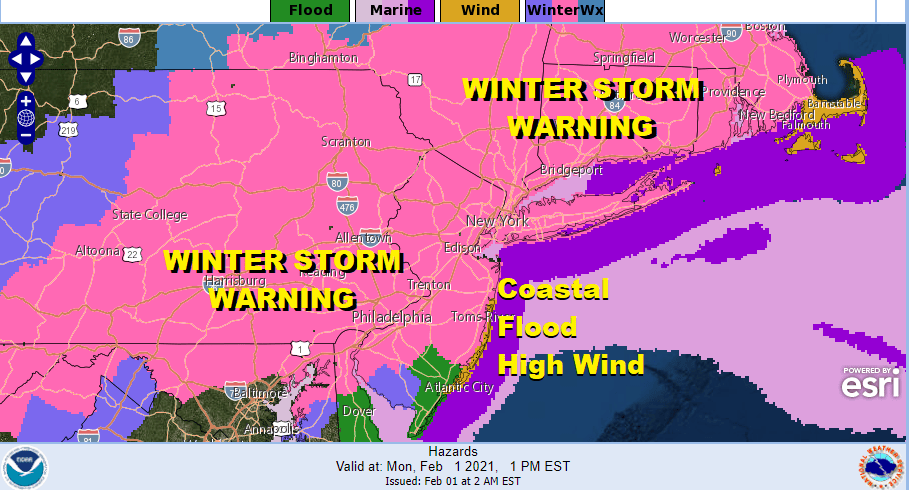 Snow fell overnight and we are going to see more snow today heavy at times across Eastern Pennsylvania to Southern New England. The secondary low off in North Carolina is now strengthening and moving northward pushing moisture northward. Winter Storm Warnings continue today for much of the Northeast for heavy snow. In addition we have High Wind and Coastal Flood Warnings out for coastal areas where moderate to major coastal flooding is expected during high tides Monday into Tuesday.