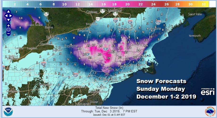 Here is the latest snow forecast map from the National Weather Service. Some numbers have been nudged a little bit with some of the highest amounts in the Hudson Valley and upstate NY coming down just a bit while other remain about the same or a touch lower. We remain unchanged on our snow forecast final call we put out yesterday.
