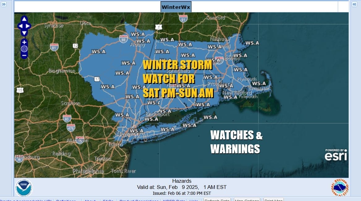 The next in a long series of storm systems will be heading into the Middle Atlantic and Northeast Saturday afternoon into Sunday morning and Winter Storm Watches are posted for much of Central and Southern New England to Long Island, NYC, Northeastern New Jersey, the Hudson Valley and the Catskills. Additional watches will probably go up for Northwest New Jersey and Northeastern Pennsylvania later today.