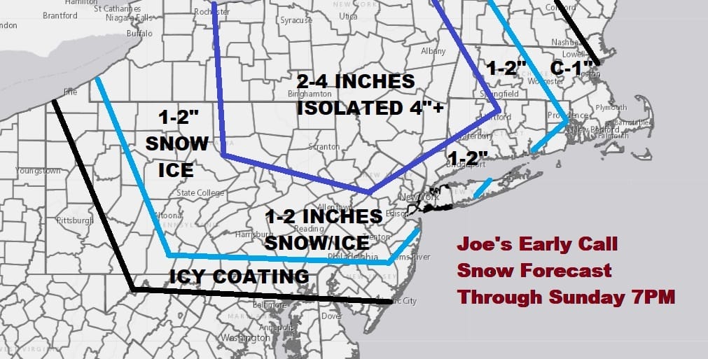 We are going to hold on to my original early call snow forecast for the time being. The northern areas north and northwest of NYC look okay. Some adjustments may need to be made in areas to the south. We opted for the cautious route here. The first round will be ending from southwest to northeast later Sunday afternoon and evening. Then we wait for a second round for Monday which could put down a more sizable accumualtion of snow or sleet changing over to snow.