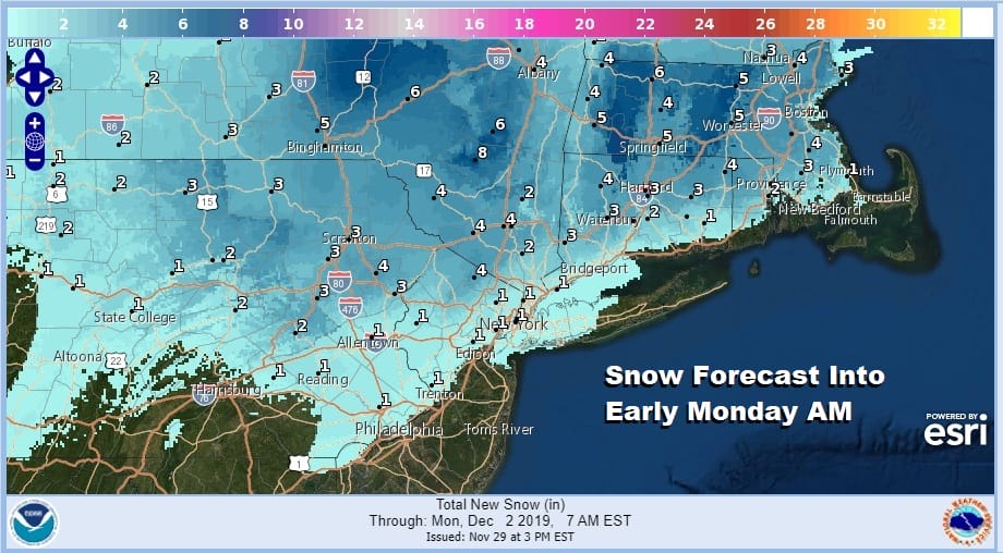 Here is the latest updated National Weather Service snow forecast map for much of the Northern Middle Atlantic States to New England. It only goes to early Monday morning and does not include what follows Monday afternoon into Monday night. Amounts have been raised somewhat over inland areas.