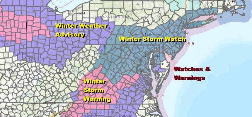 Winter Storm Watch is posted for much of the area from Eastern Pennsylvania to Southern New England including all the big cities up and down the I-95 corridor from Washington DC to NYC. Additional winter storm watches will probably go up for areas east of NYC later today or tonight. We will likely see warnings issued tonight for many areas in the watch zone.