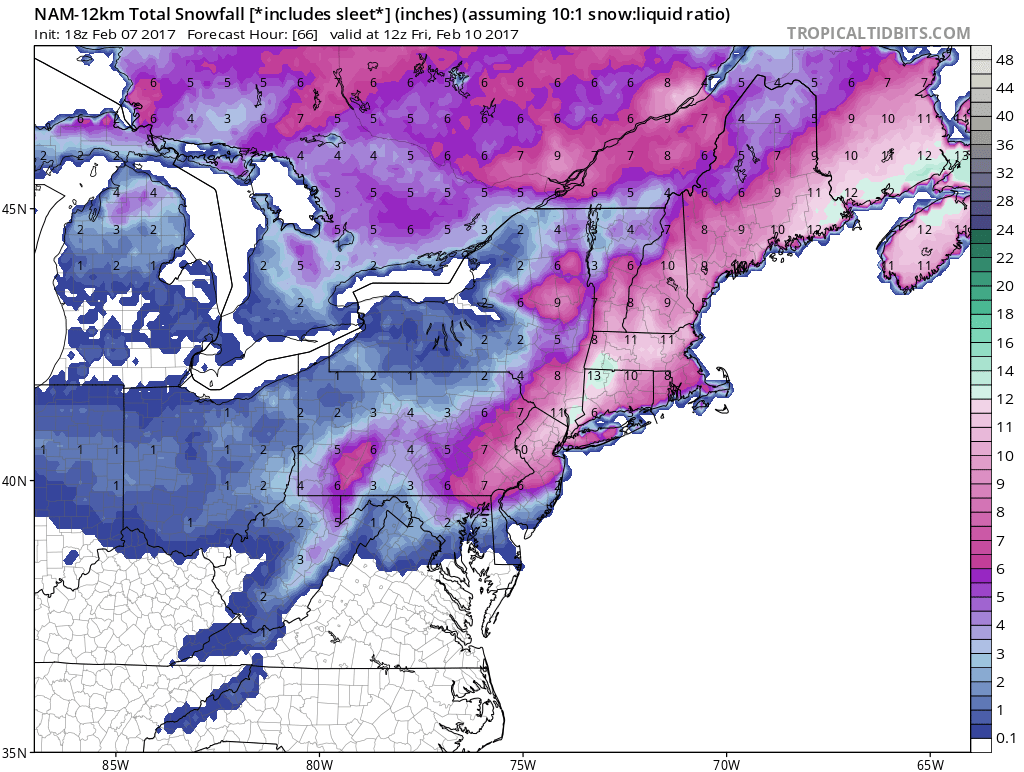 The NAM model remains consistent as it shows the developing storm moving off the coast and then moving northeastward bringing the heaviest snow bands right over the area. The NAM has led the way with this and other models have been pulled to its view so we are going to stick with it especially now that we are in the short range.