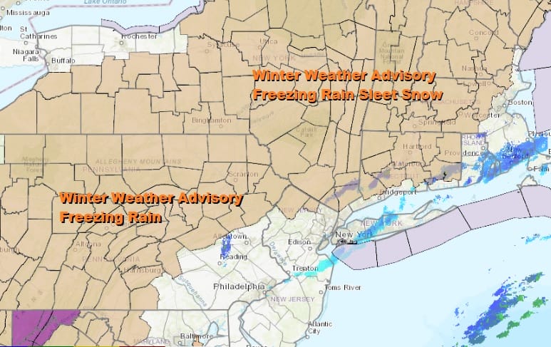 Winter Weather Advisory Eastern Pennsylvania Northwest NJ, Hudson Valley Connecticut Freezing Rain Wintry Mix