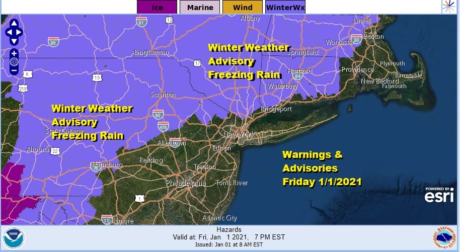 A very Happy New Year to all and we start the New Year with a winter weather advisory up for most areas from West Virginia, across Pennsylvania and New York State, a small portion of Northwest New Jersey, the Hudson Valley except for lower Westchester, and Connecticut except for areas south of I-95.