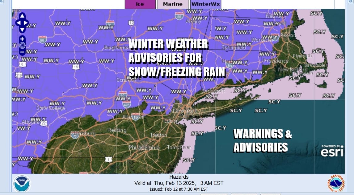 Last night’s storm system has now moved away to the east after leaving as little as a coating in areas from Northern Westchester and Northern Connecticut to 6 to 8 inches in the southeasternmost counties of New Jersey south into Delaware. Another storm is heading to the Great Lakes and that is setting inland areas up for a little snow and freezing rain this evening before a change to all rain occurs. Winter Weather Advisories are up for this possibility but this will not be a big deal.