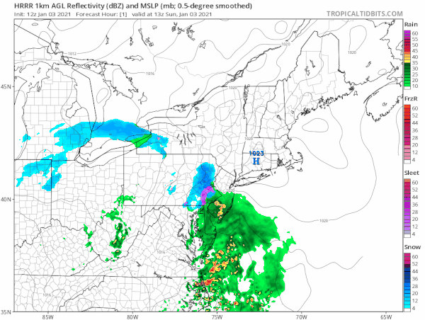 Our low that is moving up the coast will slowly slide to the east tonight. That will lead to round two of precipitation which will be mostly snow inland and north and mostly rain or a mix along the coast. The HRRR model shows the low moving from west to east and it all ends overnight.