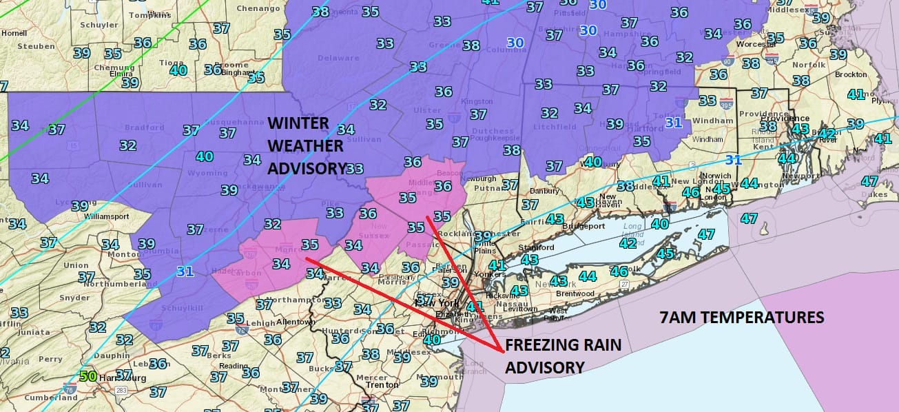 Winter Weather Advisory is up for the Hudson Valley north of Route 84 and also for parts of Northeast Pennsylvania and Northwest New Jersey. Rain is advancing this morning on the satellite and radar but temperatures are at or just above the freezing mark at the moment in those affected areas.