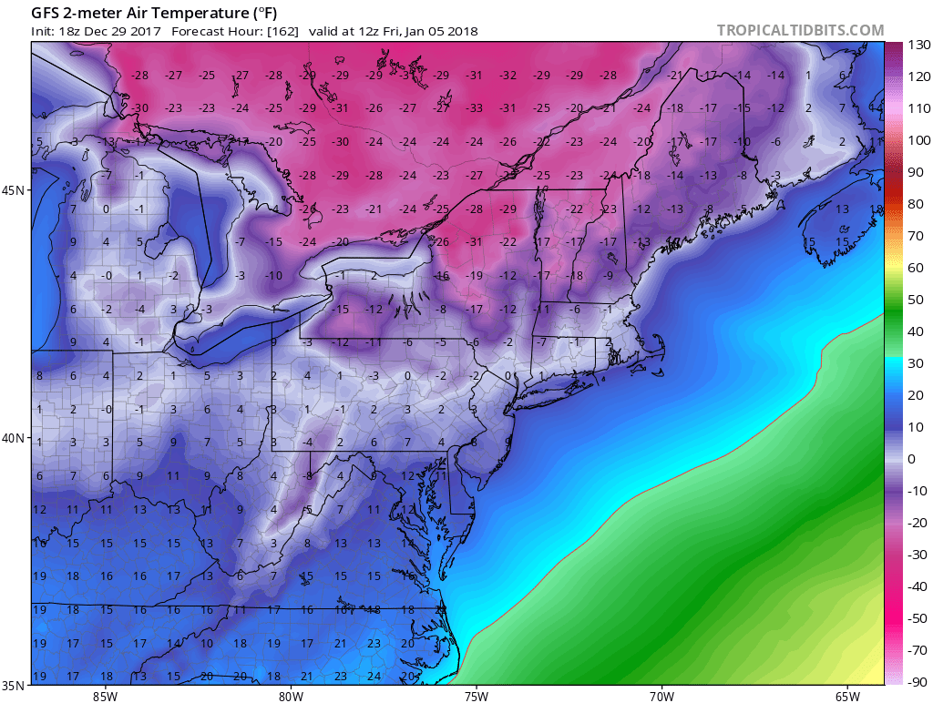 The deep trough that models are forecasting in the Eastern US later next week will be too far east to bring a snow storm as we discussed earlier but the flow from the Arctic will come right into the Eastern US. Beginning Friday morning January 4th through Sunday morning January 6th, we will see brutal cold air drop into the Eastern US where the core of the cold air comes in with very little moderation. Clouds, wind speed and wind direction will be key but i think that below zero readings for at least parts of our area are likely on at least one if not all three days for areas from Philadelphia to NYC north and northeastward. It would not take much for NYC & Philadelphia to be included in this. Boston Providence and Hartford certainly will be. Snow cover here would make it a guarantee but there won’t be much of that near the coast since next week baring any last minute surprises will be dry.